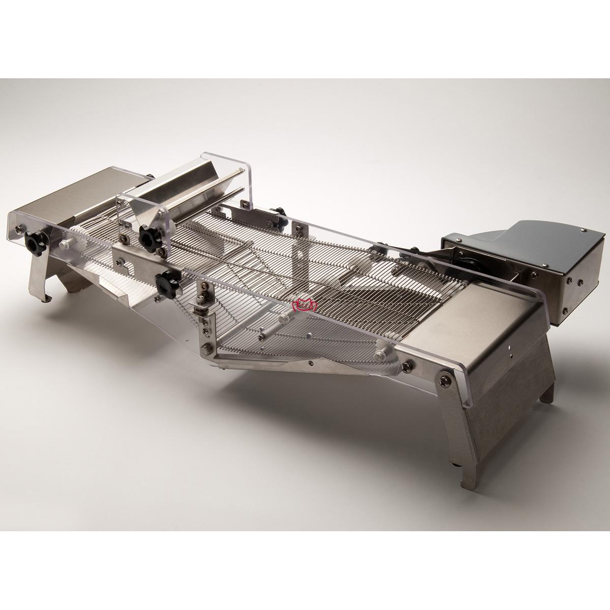 ChocoVision's Enrober is designed to fit atop the (45 lb capacity) Revolation 3Z and is a moving 6-inch-wide stainless steel belt that passes through a flowing curtain of tempered chocolate. This curtain is provided by the ChocoVision Skimmer or Dispenser (sold separately). As your ganaches, cookies, pralines, pretzels, bars (et al.) travel on the Enrober, they will be coated over their entire surfaces, bottom included. Increase productivity while maximizing the consistency of your products with the Enrober at a fraction of the cost of most. This unit is made of three easy-to-disassemble sections, making cleanup simple.
