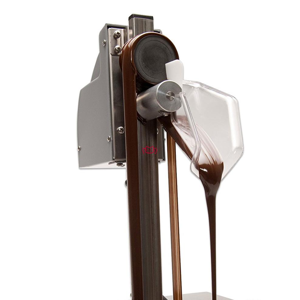 The Chocovision Skimmer is a belt, pulley and motor system that connects to a tempering unit's baffle, and will create a continuously dispensing flow of chocolate (at variable speed) through its bucket or spout into molds or onto individual pieces. The Skimmer is also helpful in reducing splatter and the spread of moisture or other contaminants into a pool of chocolate, while decreasing ergonomic strain with its automation. The Skimmer is easy to disassemble for cleaning.