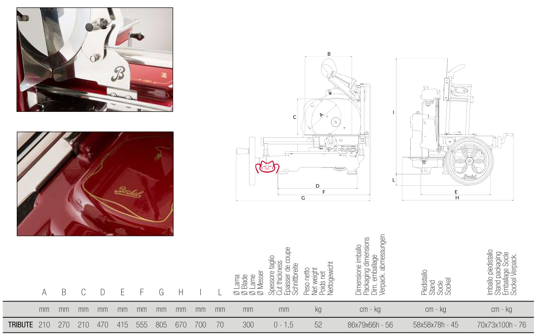 特征:Tribute的靈感來自最著名的Berkel車型之一。花飛輪,金色裝飾和典雅的設(shè)計(jì)使這款切肉機(jī)真正向傳統(tǒng)致敬。這種手工制作的機(jī)器深受美食愛好者和那些知道完美切割對(duì)維持和提高產(chǎn)品質(zhì)量至關(guān)重要的人的贊賞。其相當(dāng)大的切割能力使其非常適合那些喜歡真實(shí)事物味道的人,而其優(yōu)雅性使其非常適合那些喜歡美麗事物的人。刀片直徑為300毫米。它有2種標(biāo)準(zhǔn)顏色:紅色和黑色。它的配件包括帶有新藝術(shù)風(fēng)格裝飾的基座。