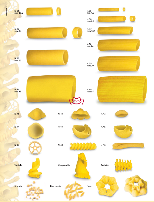 標(biāo)配4種意面模具(如6號、17號、20號、36號),可根據(jù)需求選配多種不同形狀的模具以及自動(dòng)短意面切刀。用戶可以制作多種類型的意面,如意大利面、寬面、寬條面、千層面、通心粉、螺旋面等。