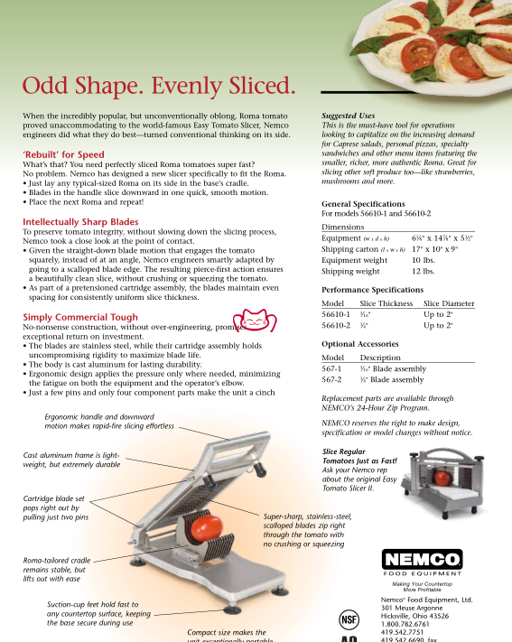 特征:Roma Tomato Slicer, 3/16" slice, razor-sharp blades, pretensions scalloped blade assembly, cast aluminum frame, suction-cup feet, NSF