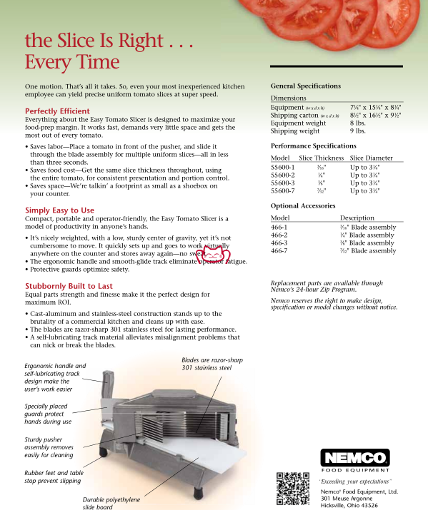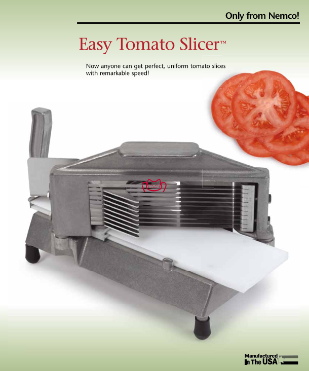 特征: Easy Tomato Slicer™, manual, 7-1/4"W x 15-1/4"D x 8-1/4"H closed dimensions, 3/16" slice, stainless steel blades, self-lubricating track, vertical handle, protective guards, polyethylene slide board, cast aluminum & steel construction, rubber feet, NSF