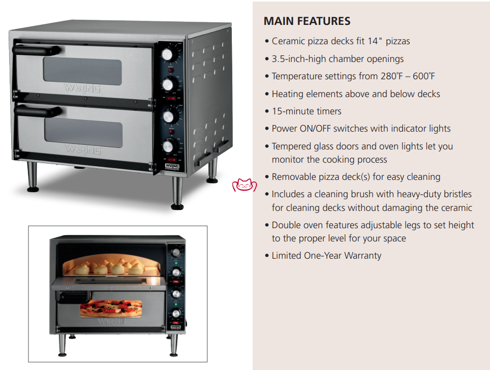 特征:使用 Waring® WPO350 雙披薩烤箱,將披薩添加到您的菜單中并產(chǎn)生另一個收入來源。該設(shè)備旨在一次完美烘烤兩個披薩,非常適合快餐店、小賣部、便利店和自助餐廳,可快速為顧客提供一兩片或一整個披薩。易于使用,節(jié)省空間的設(shè)計適合任何柜臺