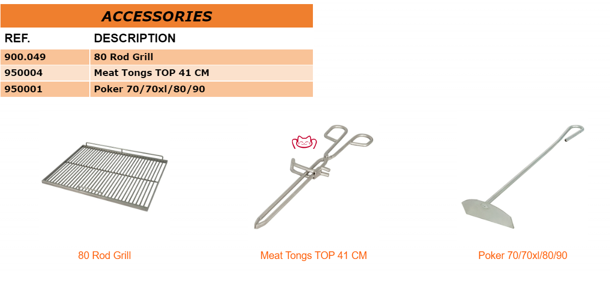 附件: 1 Meat tongs,1 Poker,1 Inox rod grill Pira 80 .