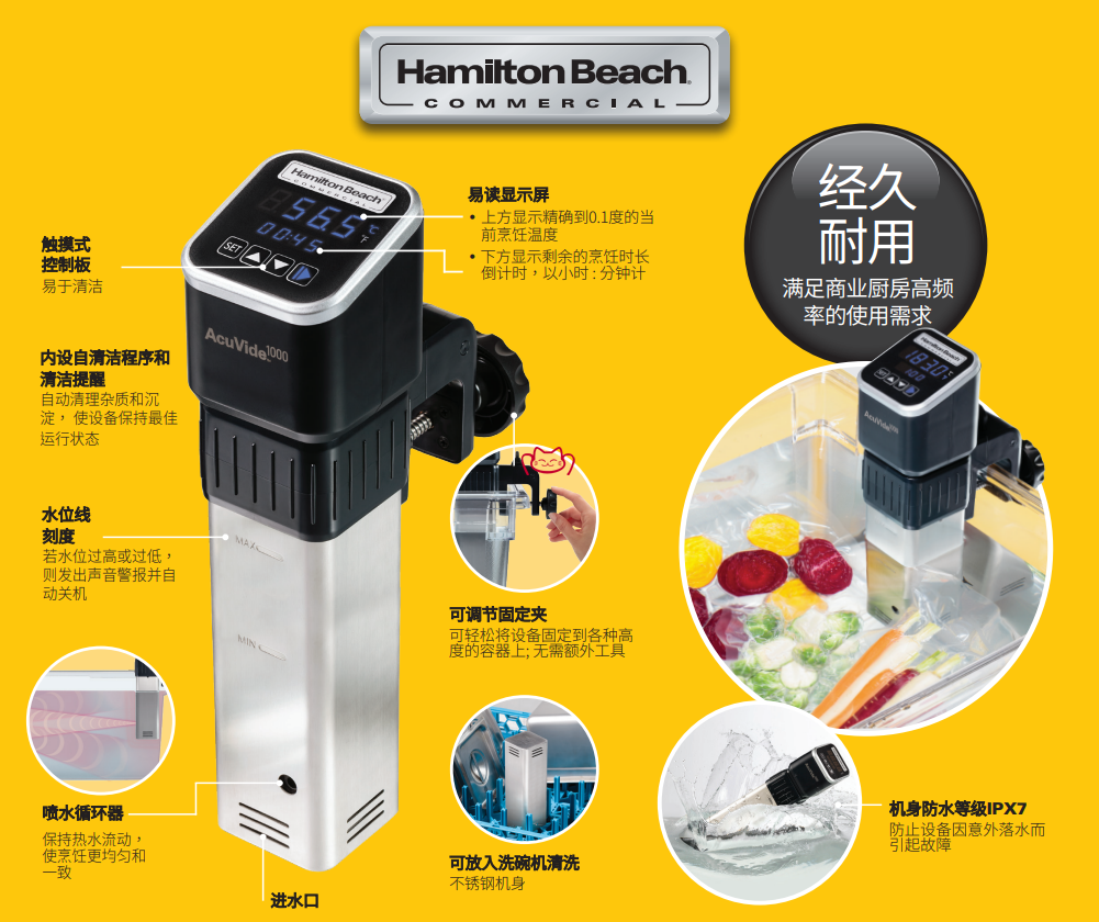 HAMILTON BEACH HSV1000-CN 具備 0.1°C 溫控精度,可精確控制水溫在最高 95°C(203°F),保證慢煮過程中的溫度穩(wěn)定性,避免食材過熟或營養(yǎng)流失,適合商業(yè)廚房和家庭高端烹飪使用。