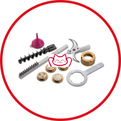 標(biāo)配附件如下:4個(gè)青銅制面模具(n.77 maccheroni, n.35 tagliatelle, n.220 casarecce and n.240 fusilli)、清潔刷、模板拆卸工具、漏斗.