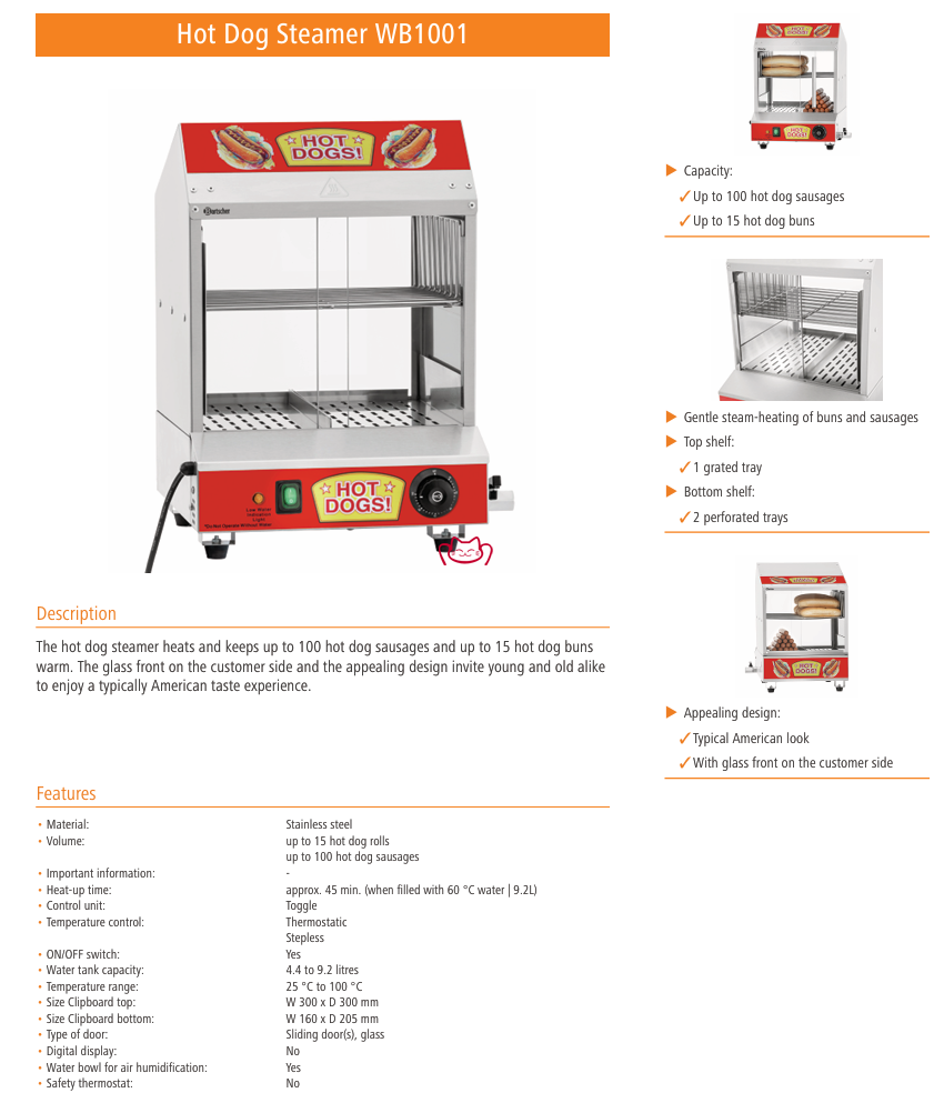 特征: 熱狗蒸鍋可加熱并保溫多達(dá) 100 根熱狗香腸和 15 個(gè)熱狗面包。客戶側(cè)的玻璃前部和吸引人的設(shè)計(jì)讓年輕人和老年人都能享受典型的美式口味體驗(yàn)。