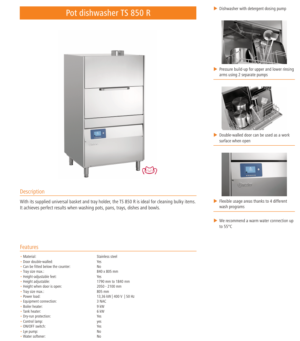特征:TS 850 R 配備通用籃框和托盤架,非常適合清洗體積較大的器具。在清洗鍋具、烤盤、托盤、碗碟等物品時,能夠實現理想的清潔效果。