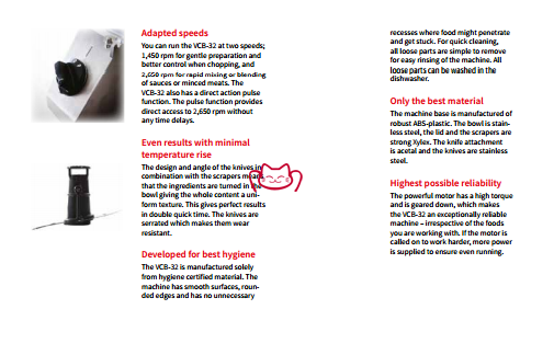-VBC-32 配有刮刀系統(tǒng),旨在防止食物卡在碗內(nèi)和碗蓋上。刮刀臂將食材移回刀具,縮短制備時間。