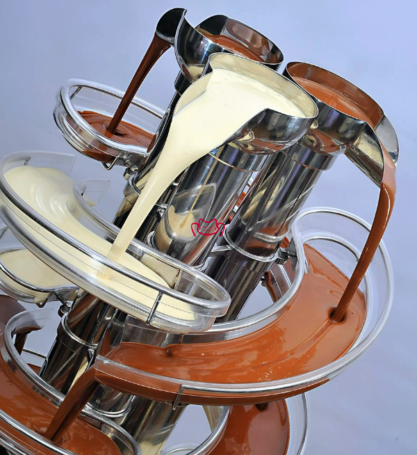 牛奶巧克力、黑巧克力、白巧克力或任何口味的巧克力流過傾斜的層層,給人以 3 條巧克力河流的印象,這些河流在彼此之間流淌。
