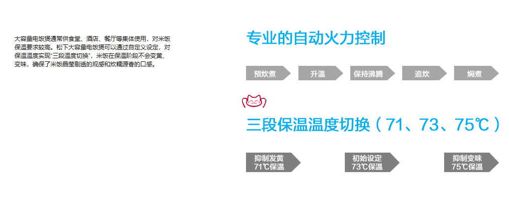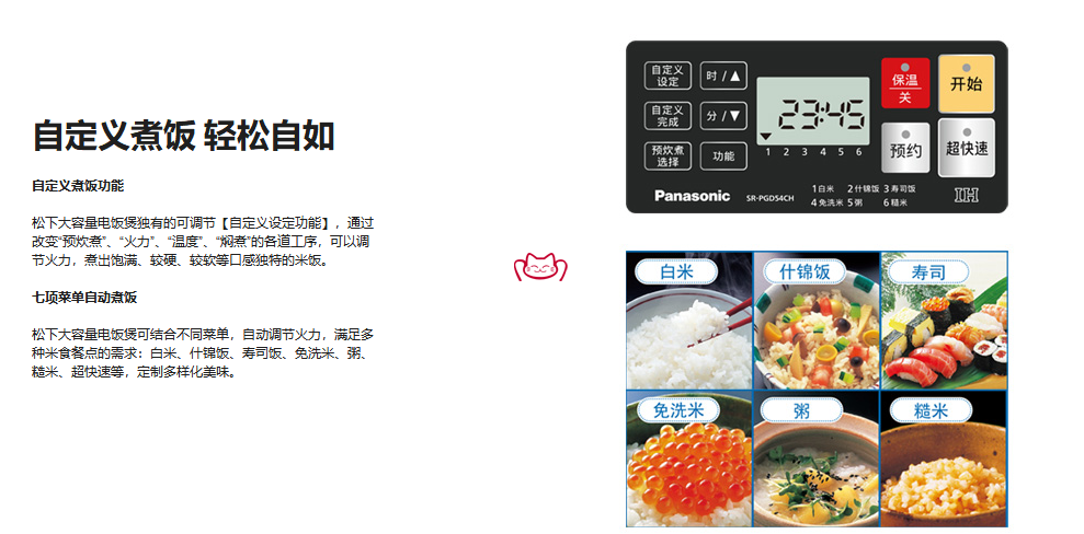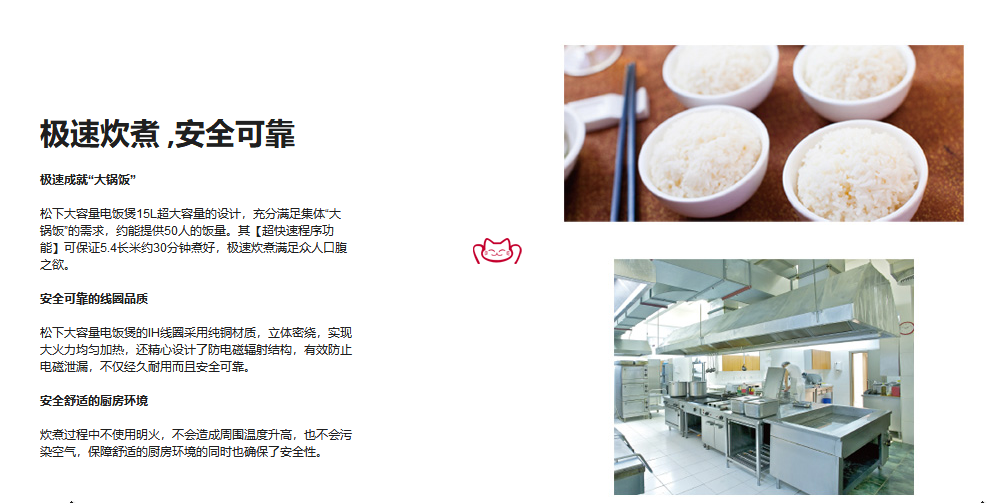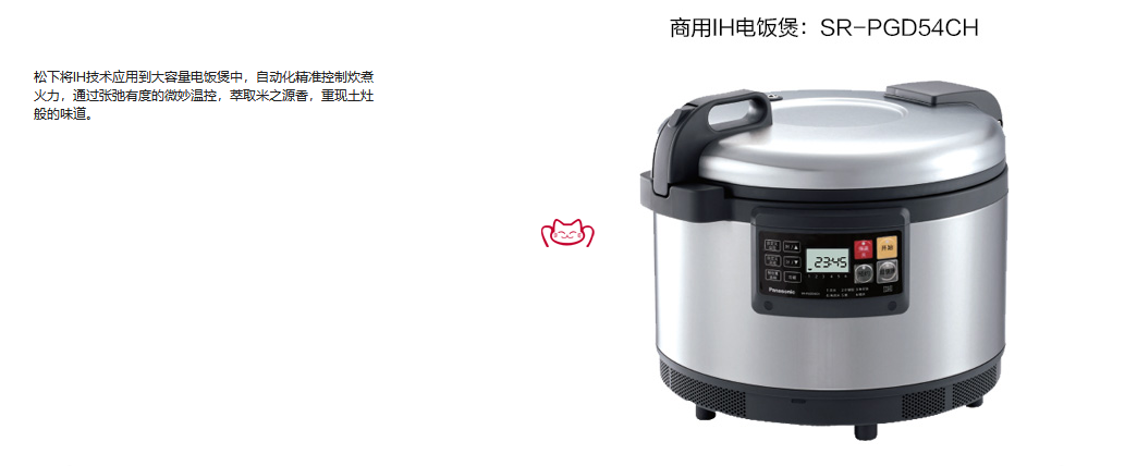 產(chǎn)品定位: 松下PANASONIC SR-PGD54CH極速烹飪大容量飯煲,通過創(chuàng)新的火力控制與高導(dǎo)熱涂層技術(shù),以最快30分鐘時間煮熟5.4L大米,是商業(yè)廚房高效、專業(yè)的飯煮解決方案。