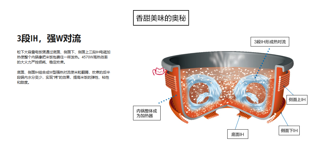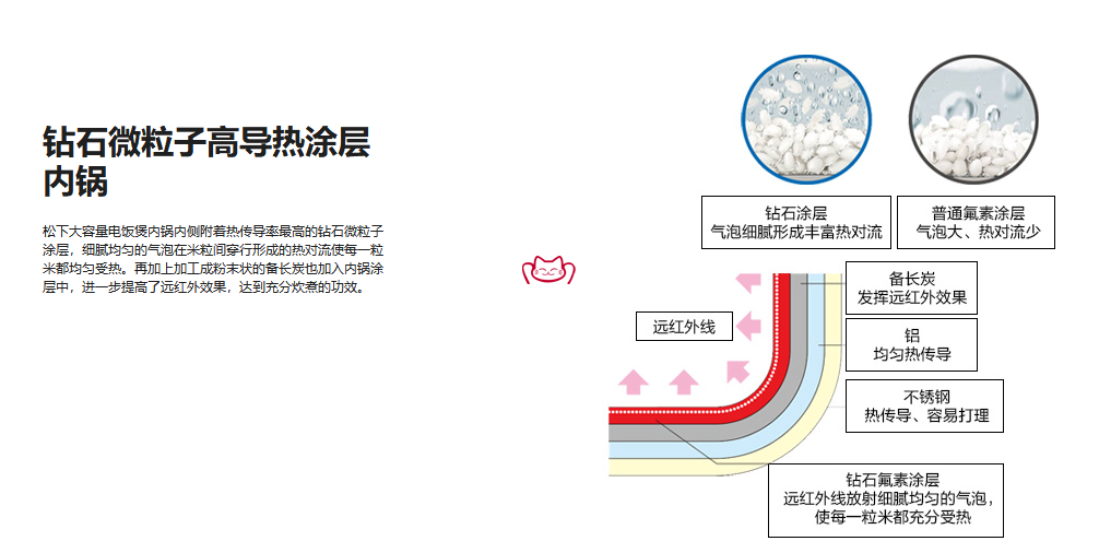 技術(shù)創(chuàng)新: 該飯煲采用先進的自動火力調(diào)節(jié)技術(shù),能夠根據(jù)不同的米種和食材自動調(diào)整加熱力度,避免了傳統(tǒng)飯煲需要人工干預(yù)的繁瑣。而內(nèi)鍋的鉆石微米子涂層進一步增強了熱傳導(dǎo)效率,確保飯煲在高速運作下也能保持較長的使用壽命和較低的維護成本。與其他同類產(chǎn)品相比,松下飯煲在穩(wěn)定性、節(jié)能性及烹飪效果上更具優(yōu)勢。