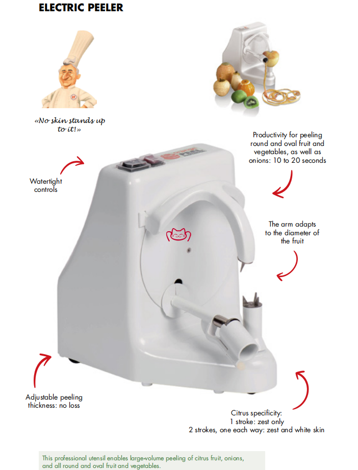 特征:電力專業(yè)果皮 - 去皮柑橘類水果,洋蔥以及全圓和橢圓形的水果和蔬菜。 可調(diào)節(jié)厚度。 柑橘的特殊功能:1 GO:僅皮,或2次通過GO返回:皮和白皮膚。 控制密封。